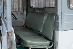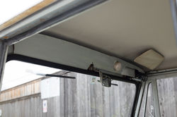 The interior of this 110 needs some love. The front passenger seat has some fray and tears where the rears are in good shape. The dashboard, and headliner are in good overall condition. The door panels need to be reupholstered or replaced. The under-dash AC unit functions as it should, and all vents are intact. The cargo area of this defender was used for what it was intended for and shows wear and aluminum corrosion. Over the rear interior tubs, you will find chassis braces. The headliner is clean and original. The interior does need work but is fully functional.